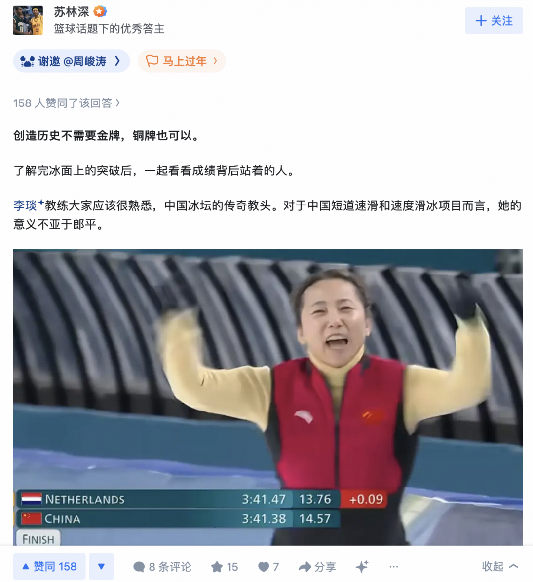 “创造历史不需要金牌,铜牌也可以”,知乎答主苏林深接着说到,“对于中国短道速滑和速度滑冰项目而言,她(李琰教练)的意义不亚于郎平”。我们为什么会期待短道速滑队为我们带来首金?就是因为她的一众弟子们曾经带着中国荣耀站在世界之巅,王濛,武大靖,周洋……