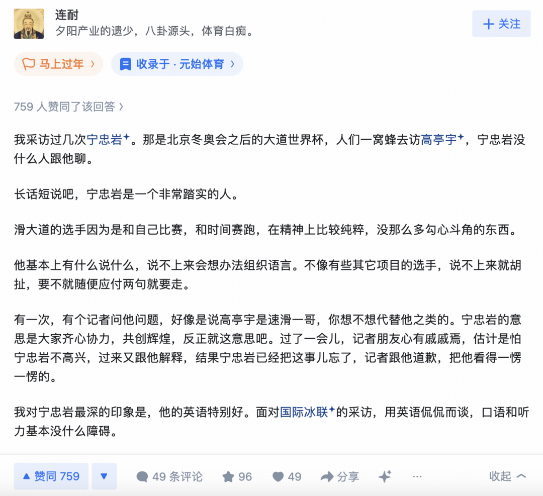 这个故事来自于一位体育记者连耐在知乎上的回忆。他称宁忠岩是一个非常踏实的人,“他基本上有什么说什么,说不上来会想办法组织语言”,以及还有一个特性,英语非常好,面对国际冰联的采访,用英语侃侃而谈,口语和听力基本没什么障碍。