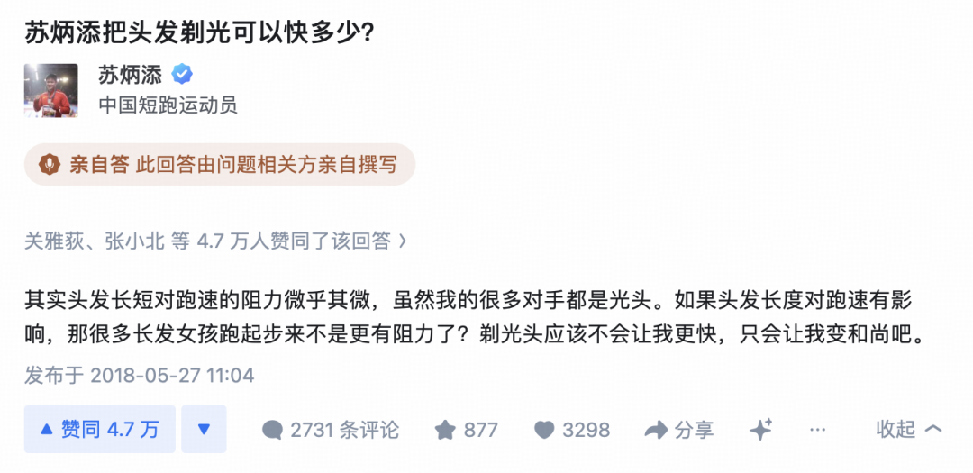 苏炳添把头发剃光可以快多少?苏神回复称,“其实头发长短对跑速的阻力微乎其微,虽然我的很多对手都是光头。如果头发长度对跑速有影响,那很多长发女孩跑起步来不是更有阻力了?剃光头应该不会让我更快,只会让我变和尚吧”。